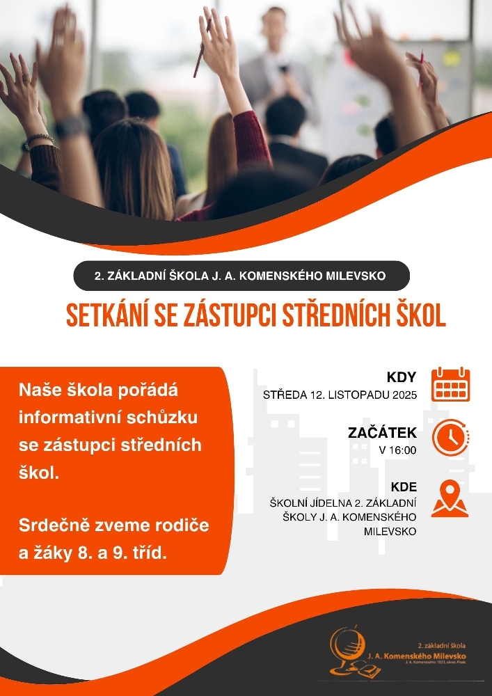 Dne 12. listopadu 2025 pořádala naše škola ve školní jídelně informativní schůzku se zástupci středních škol. Na společném setkání představili svoji školu žákům 8. a 9. tříd a jejich rodičům. Rodiče dále získali informace ohledně přihlášek a přijímacího řízení na střední školy. Děkujeme všem zástupcům středních škol za prezentaci a rodičům za hojnou účast. Žákům přejeme úspěšný výběr dalšího vzdělávání.