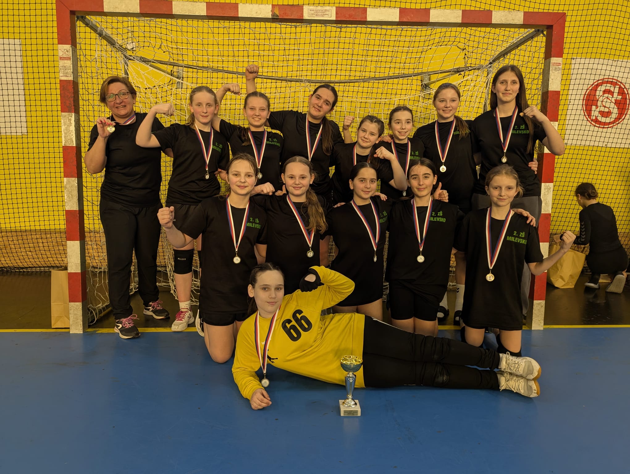 Tým tvořily: Špalová Tereza 5. B, Šimáková Justýna 5. B, Vildtová Zuzana 5. B, Jircová Anna 6. A, Němcová Pavlína 6. A, Kašparová Sára 6. A, Šiková Natálie 6. A, Zahradníková Viktorie 7. A, Monina Diana 7. A, Kodadová Karolína 7. B, Slámová Karla 7. B, Vildtová Aneta 7. B a trenérka Matějková Natálie 9. B